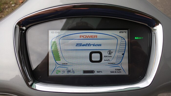 Eine Ladung des 4,2-kWh-Akkus reicht für realistische 70 Kilometer. Piaggio gibt in der Werbung zwar 100 Kilometer an, das gilt aber nur für den Eco-Modus, der das Maximaltempo auf 30 km/h drosselt. Theoretisch kann man per Rekuperation zweistufig Bremsenergie zurückgewinnen, angesichts der geringen Bremswirkung kann das aber nicht viel sein.