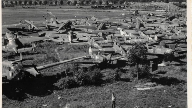 Kreuz und quer stehen im Sommer 1945 Maschinen am beschädigten Flughafen in Klagenfurt. Die ersten Wochen nach Kriegsende werden auch bei den Briten geprägt von Einfachheit und Improvisation. Die Soldaten schlafen in Zelten am Flughafengelände, werden in erster Linie durch Gulaschkanonen verköstigt.
