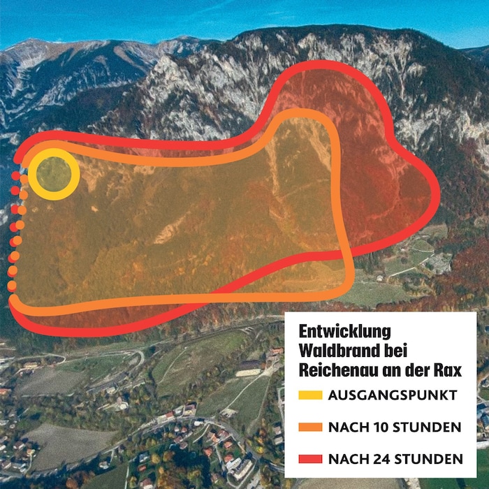 Seit der ersten Alarmierung mit Brandverdacht am 25. Oktober um 11.28 Uhr stehen Einheiten von Feuerwehr, Bergrettung, Polizei und Bundesheer vor Ort im Dienst, um das Flammeninferno einzudämmen und Schlimmeres zu verhindern. In weniger als zehn Stunden hatten sich ja die Flammen, wie berichtet, von lediglich fünf auf mehr als 100 Hektar Forst im Besitz der Stadt Wien ausgebreitet – und in weniger als 24 Stunden brannte fast der gesamte Hang (siehe Grafik).
