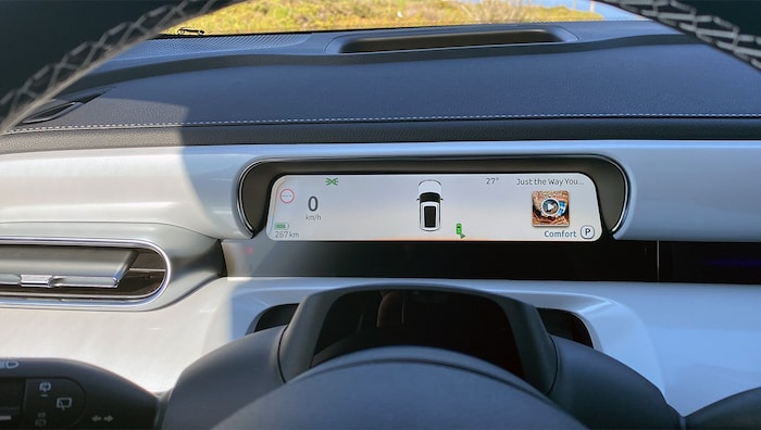 Über allem thront ein mächtiger 12,8-Zoll-Touchscreen mit ein paar im Rahmen platzierten Hardkeys, u.a. für Warnblinkanlage und Fahrmoduswahl. Das sehr querformatige 9,2-Zoll-Tachodisplay ist ins Armaturenbrett integriert. Hat was von Mäusekino, ist aber gerade groß genug. Echte Tasten sitzen am Multifunktionslenkrad. Deren Funktion ist zwar nicht bei jedem Lichteinfall erkennbar, dafür sind sie besser bedienbar als die mittlerweile bei Mercedes üblichen Touchelemente.