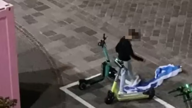 Danach warfen die Burschen, sie waren mit Leihscootern und einem Rad gekommen, die Fahne auf den Boden und traten sie. Auf dem Video ist auch zu sehen, dass mehrere Passanten die Situation beobachtet und weiter gingen.