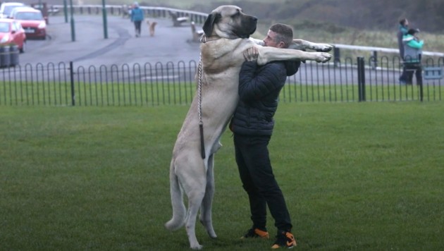 „Abu“ ist vermutlich der größte Hund Großbritanniens: Der türkische Hirtenhund aus Redcar bringt mehr als 114 Kilogramm auf die Waage, das Futter kostet Besitzer Dylan Shaw ein kleines Vermögen.