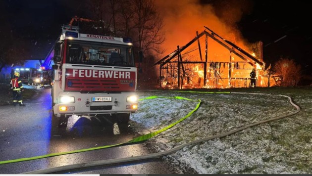 11 Feuerwehren waren in Kematen an der Krems im Einsatz, ein landwirtschaftliches Nebengebäude stand in Vollbrand. Entdeckt hatte das Feuer die Besatzung eines Rettungsautos, das gegen 5.10 Uhr an der Stelle vorbeigefahren war. Die traurige Bilanz: 34 Stiere wurden getötet, 49 gerettet. Das Löschwasser löste auch Glatteis aus