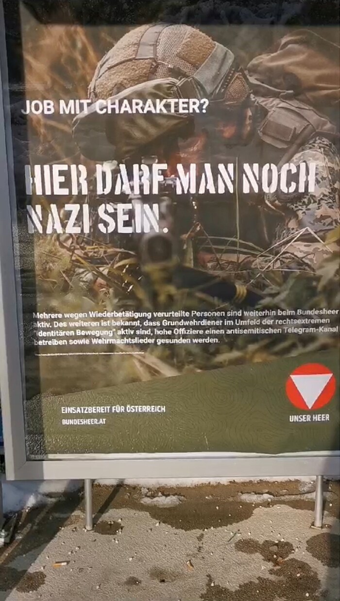 „Job mit Charakter? Hier darf man noch als Nazi aktiv sein“, stand in großen Buchstaben auf der gefälschten Werbung. Am Dienstag um 11.45 Uhr wurden die beiden Plakate von der Polizei aus den Schaukästen genommen. Die Betreiber der Werbefläche versicherten, dass sie damit nichts zu tun hätten.