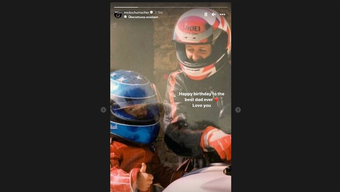 „Happy Birthday to the best dad ever - Love you“, schreibt der 24-jährige Deutsche in seiner Story zu einem Foto, das ihn als kleiner Junge neben dem erfolgreichen Papa zeigt. Mick zeigt den Daumen nach oben. Beide tragen einen Helm, die Leidenschaft zur Formel 1 hat Vater und Sohn offenbar schon immer verbunden.