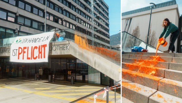In Innsbruck machte am Montag einmal mehr die „Letzte Generation“ mit einer Aktion auf sich aufmerksam. Klimaaktivisten nahmen dabei die Universität ins Visier und übergossen dort unter anderem eine Stiege mit oranger Farbe. Die Kritik richtet sich erneut insbesondere an die Politik.