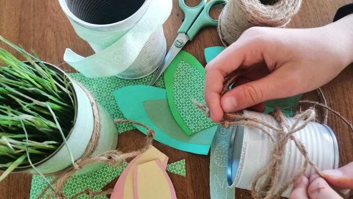 Bemale außen die Dose, trocknen lassen. Aus Tonpapier schneidest du Hasenohren (evtl. in zwei Farben überlappend) und klebst diese an den hinteren Dosenrand. Mit einem hübschen Bändchen umwickeln. Fertig fürs Bepflanzen – nimm dazu beispielsweise eine kleine Gänseblümchengruppe, Veilchen aus dem Garten oder einer Wiese. Nach dem Osterfest dürfen diese wieder zurück und weiterwachsen.