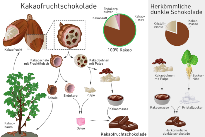 Die Kakaofruchtschokolade hat nach ETH-Angaben dank des als Süßungsmittel verwendeten Kakaogelees einen etwas höheren Ballaststoffgehalt als eine durchschnittliche Europäische dunkle Schokolade – 15 Gramm gegenüber zwölf Gramm pro 100 Gramm. Zudem enthalte sie nur 23 Gramm gesättigte Fettsäuren im Vergleich zu 33 Gramm bei einer durchschnittlichen europäischen dunklen Schokolade.