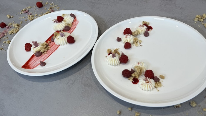 Sarah verzaubert uns diesmal mit einem „Tellerdessert“, bei dem man seiner künstlerischen Ader freien Lauf lassen kann. In der Patisserie stehen Handwerk und Präsentation im Vordergrund. Die Nachspeise im Restaurant ist schließlich der süße Abschluss eines Menüs und auch die Visitenkarte, die man mit nach Hause nimmt. Ruby-Ganache, Rosenmousse, Himbeergel und Mandel Crumble verzaubern das Auge und den Gaumen.