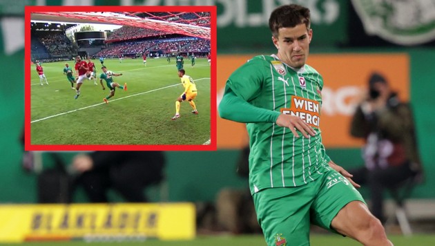 Gerade war Minute 35 im Duell des polnischen Cupsiegers mit dem österreichischen Liga-Vierten angebrochen, da gingen die Mannen von Wisla in die Offensive. Eine Flanke von Ángel Rodado von der linken Außenbahn landete gefährlich im Strafraum, wo Łukasz Zwoliński den Ball mit dem Oberschenkel zwar nicht ordentlich unter Kontrolle, aber dennoch in Richtung Tor brachte – die von seinem Körper abgespreizte Hand von Rapid-Verteidiger Auer verhinderte allerdings Schlimmeres …