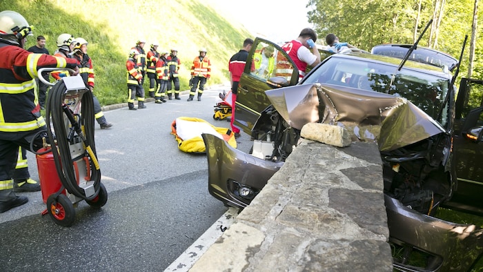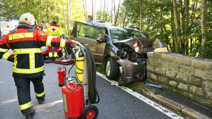 Zu einem schweren Unfall kam es am Dienstag in Laterns (Vorarlberg): Ein Pkw, in dem vier Personen saßen, kam aus ungeklärter Ursache von der Fahrbahn ab und krachte gegen eine Mauer.
