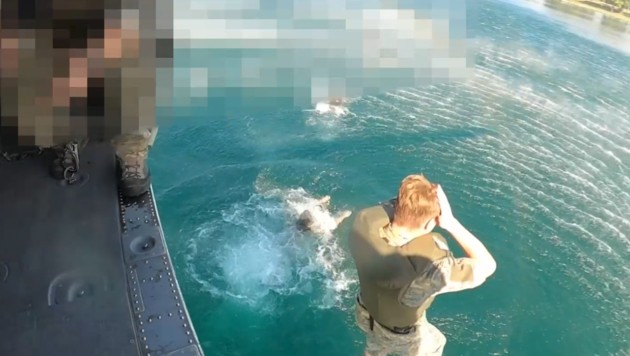 On board: eight midshipmen from the Theresian Military Academy, who had only started their studies a week earlier and were immediately thrown into the deep end. Even though the altitude was perfectly feasible, the new environmental influences caused tension: the two loud helicopter engines just above the soldiers' heads, the uncertainty on the outward flight, the "downwash" of the rotor, i.e. the downdrafts that the blades create when hovering and whirling up glistening spray.