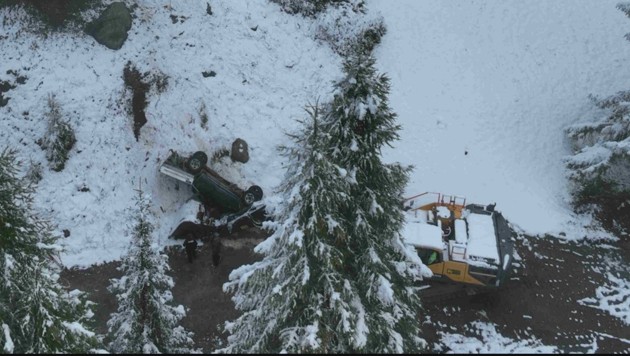Gegen 8 Uhr manövrierte ein 68-Jähriger mit seinem Pkw in der Nähe seines Hauses. Das Fahrzeug kam auf der schneebedeckten Wiese ins Rutschen und stürzte in der Folge einen steilen Abhang hinunter. Dabei überschlug sich der Pkw und kam auf dem Dach liegend an einer Baumaschine, welche unterhalb auf einem Parkplatz abgestellt wurde, zum Stehen.