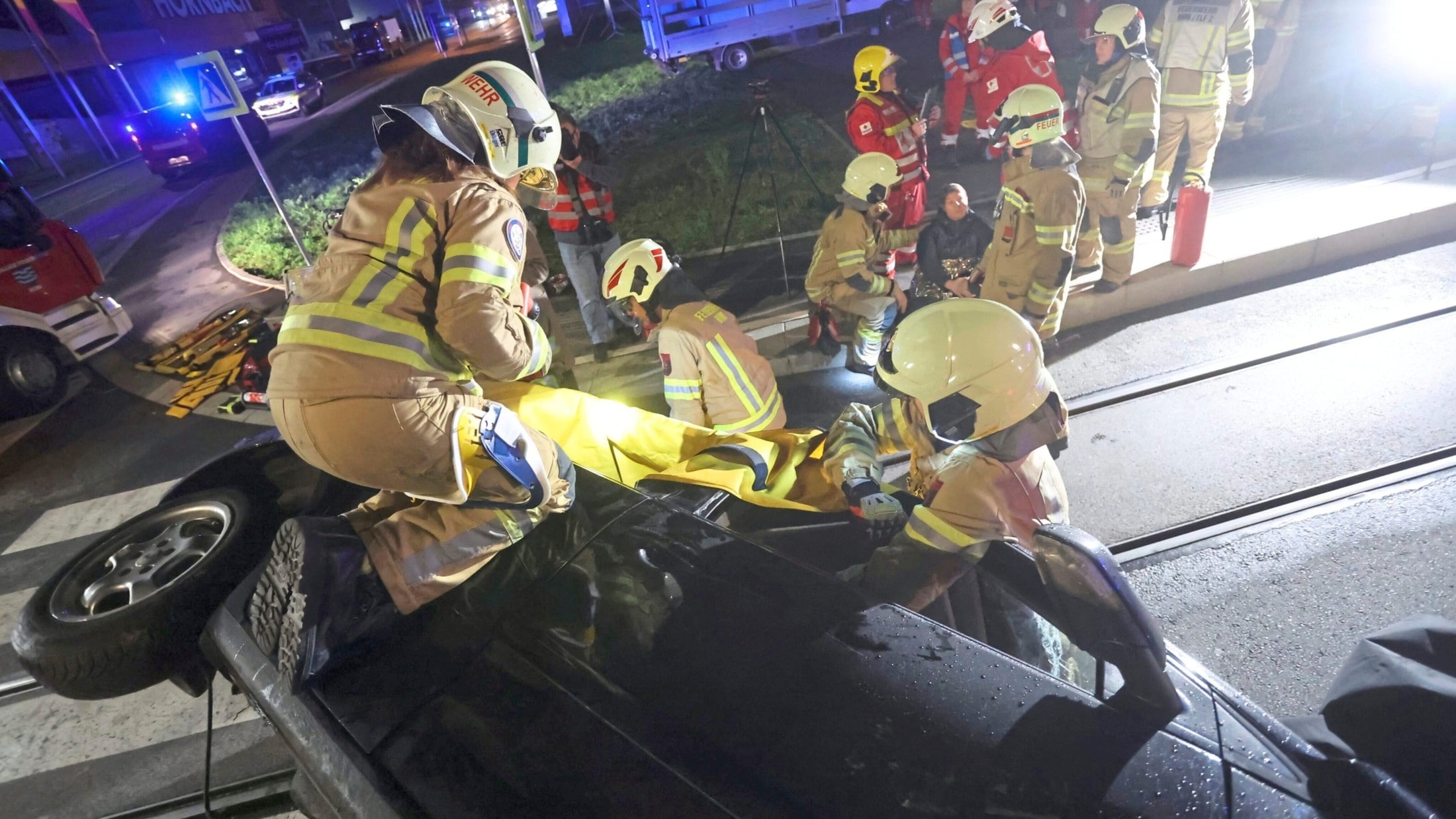 Spektakuläre Einsatzübung auf der „Linie 5“ am Donnerstagabend. Die Innsbrucker Verkehrsbetriebe (IVB) probten mit den Blaulichtorganisationen für den Ernstfall. Ein fingierter Unfall im Bereich der Haltestelle Neu-Rum Glungezerstraße löste einen Großeinsatz aus.