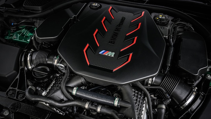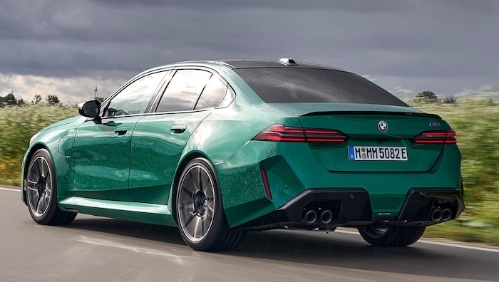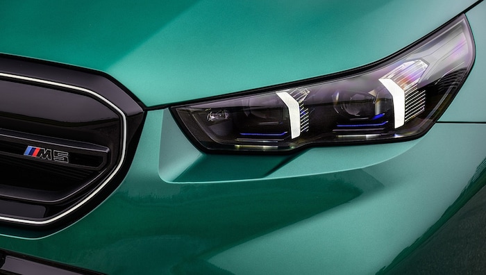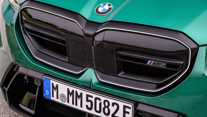 The 30 kg of the standard glass roof can be deducted if you order the optional carbon roof. Otherwise, the extra weight comes from the standard rear-axle steering as well as the overall increased dimensions. The body has grown significantly and now measures 5.10 meters in length. Compared to the current civilian 5 Series (G60) and the previous-generation M5, the new M5 is about seven centimeters wider at the front and five centimeters wider at the rear axle.