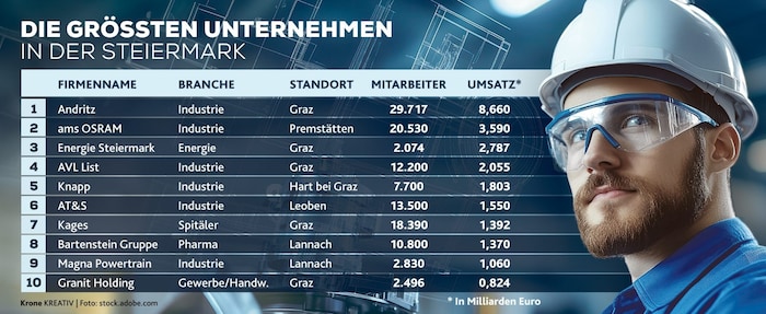 Es sind aktuell nicht die leichtesten Zeiten für die Wirtschaft. Umso erfreulicher ist es, dass die Leitbetriebe sich als relativ standfest erweisen: Sie erreichten im Geschäftsjahr 2023 einen Gesamtumsatz von 46 Milliarden Euro (ein Minus von knapp 5 Milliarden im Vergleich zum Rekordjahr 2022, aber annähernd das Ergebnis von 2021). Ähnlich sieht es auch bei der Zahl der Mitarbeiter aus: Die steirischen Top-100 beschäftigten 2023 191.628 Mitarbeiter – ein Minus im Vergleich zum Vorjahr, aber am Level von 2021.