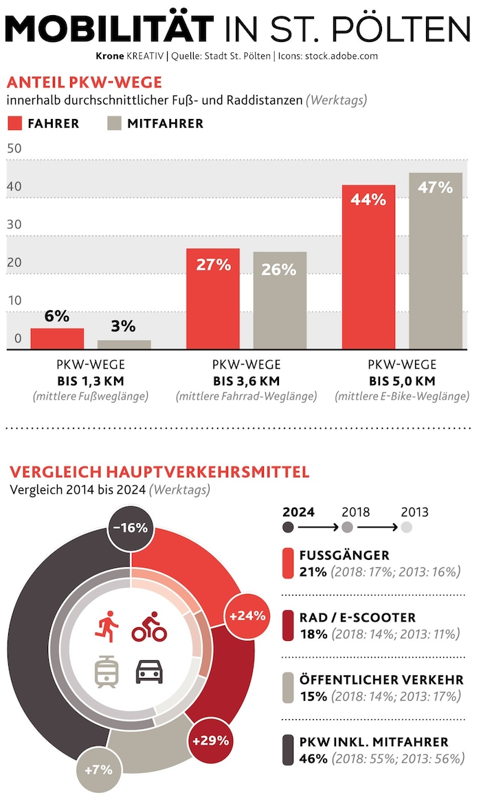 Selbst für die Stadt St. Pölten war das Ergebnis der Mobilitätserhebung überraschend: Im Vergleich zur letzten Studie aus dem Jahr 2018 geht der Trend deutlich stärker als erwartet in Richtung Umweltverbund – Rad, Öffis sowie zu Fuß) – und damit weg vom Pkw.