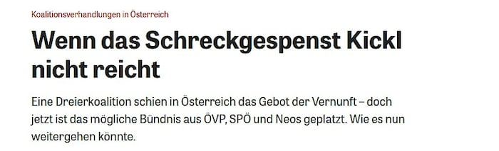 Für sie hätten die drei (ungleichen) Partner eigentlich nicht scheitern dürfen. „Sie waren zum Erfolg verdammt, angesichts des klaren Sieges der FPÖ bei den Nationalratswahlen im September. Zwischen Herbert Kickl und dem Kanzleramt standen nur noch diese Verhandlungen.“ Doch die drei Parteien hätten keine Idee gehabt, wofür diese neuartige Koalitionsregierung stehen hätte sollen. Und jetzt? „Wahrscheinlich malt Herbert Kickl schon an seinem eigenen Gemälde“, prognostiziert die „Zeit“.