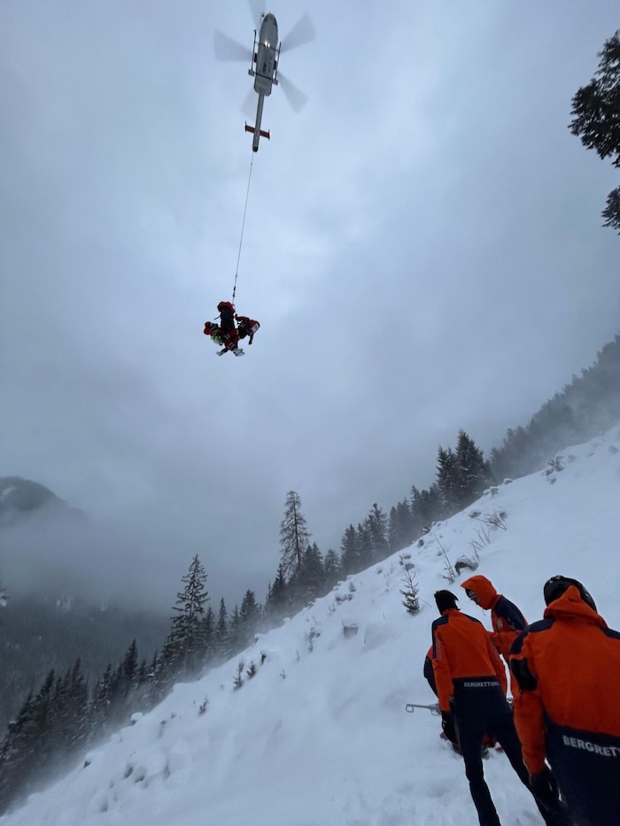 Da in dem steilen Wald keine Rettung aus der Luft möglich war, stiegen 14 Bergretter zur Unfallstelle auf. Der Bergrettungsarzt diagnostizierte ein Polytrauma. Einbrechende Dunkelheit und starkes Schneetreiben erschwerten die Bergung.