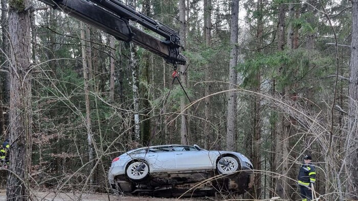 Auf einem Waldweg in der Veitsch kam am Montag ein Autolenker laut Feuerwehr wegen Glatteis von einem Waldweg ab. Dabei hatte der Mann Glück im Unglück: Das Auto blieb an zwei Bäumen hängen, dahinter geht es steil bergab.