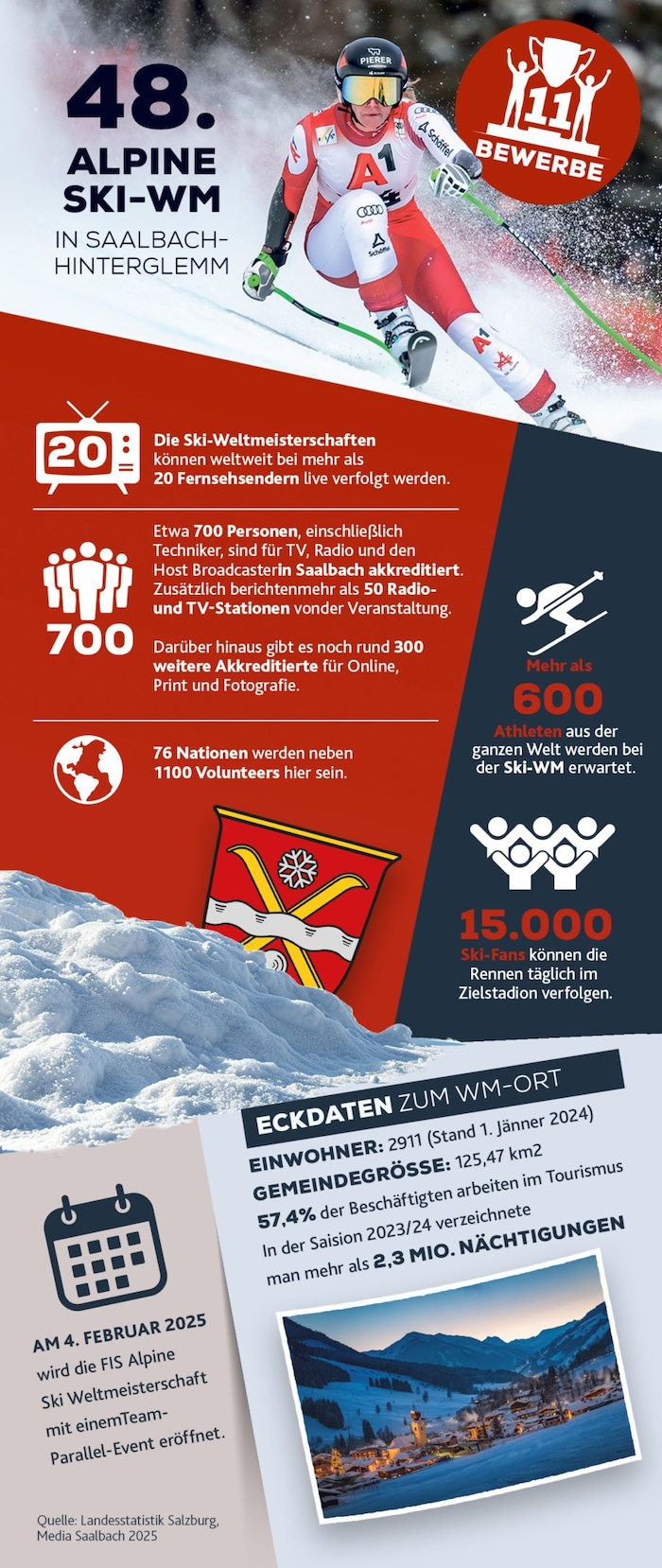 Saalbach-Hinterglemm ist zum zweiten Mal Gastgeber der Ski-Weltmeisterschaften. Die letzten Vorbereitungen laufen, die Wetterprognosen verheißen eine sonnige Party. Das erste Rennen steigt am Dienstag – Tausende Fans werden erwartet. . .