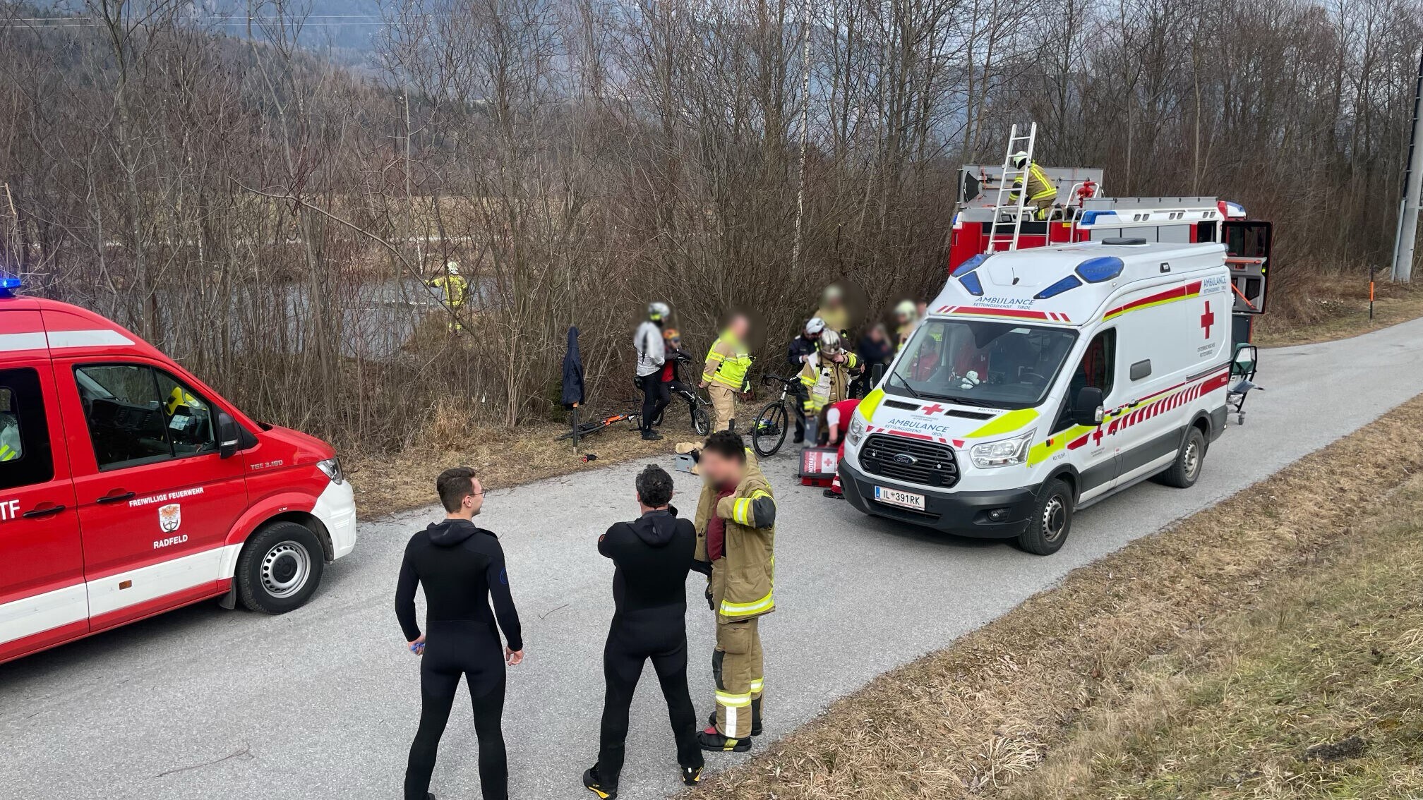 Finally, the rescuer found a long branch, which he held out to the woman. Little by little, he managed to pull the exhausted woman to the shore. The ice kept breaking, making the rescue more difficult. Together with a member of the Radfeld fire brigade, the woman was pulled out of the water.