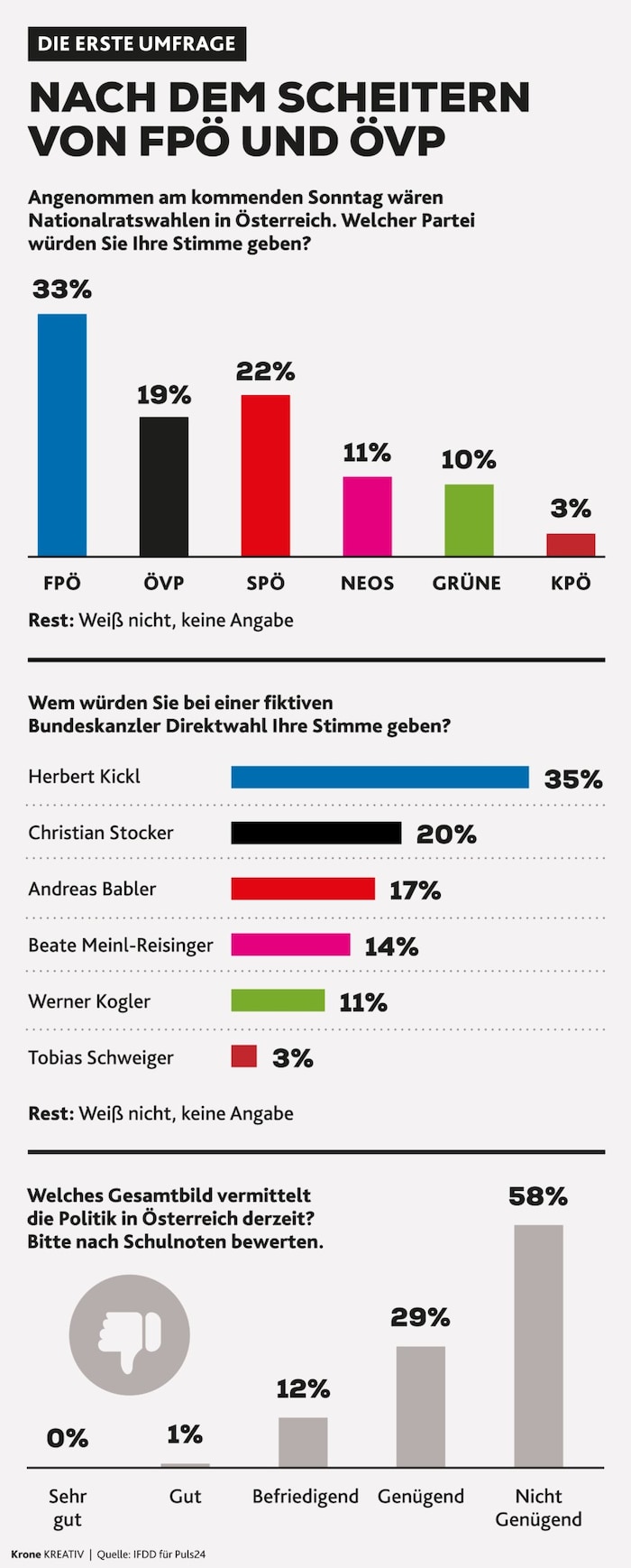 Würde eine Neuwahl tatsächlich so ausgehen, wäre auch Schwarz-Rot Geschichte, weil SPÖ und ÖVP gemeinsam keine Mehrheit hätten, die FPÖ hingegen könnte weiter zwischen Rot und Schwarz als Koalitionspartner wählen.