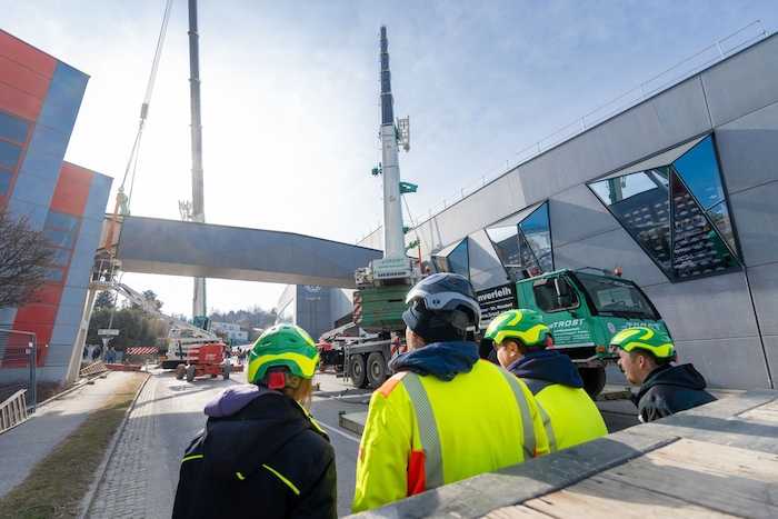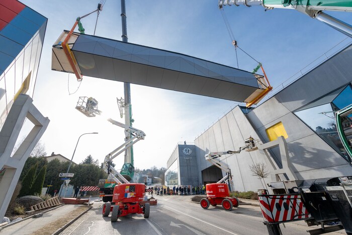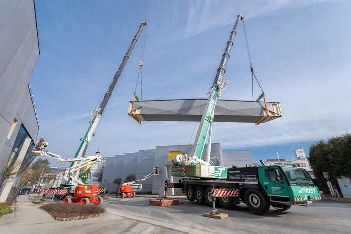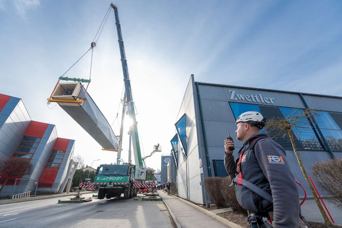 Über die Straße ragt die neue „Pipeline“ in der Waldviertler Braustadt Zwettl. Die 23 Meter lange Rohrbrücke ist ganze 33 Tonnen schwer und verbindet das neue Abfüllzentrum mit dem Brauhaus. Welche beeindruckenden Zahlen der Bau sonst noch liefert und wie die Montage ablief – die „Krone“ hat die Bilder. Prost!