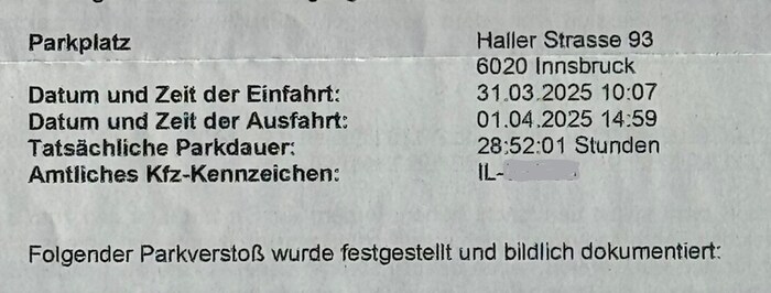 Als der vermeintliche Parksünder den Brief dann genau unter die Lupe nahm, offenbarte sich eine weitere und noch viel größere Merkwürdigkeit. Mehr als 28 Stunden soll der Tiroler auf dem Parkplatz gestanden sein. „Wie kommen die zu so einer Feststellung?“, wunderte sich der Autofahrer. Zumal in dem Schreiben betont wurde, dass der Parkverstoß bildlich dokumentiert sei. ParkRaum Management verwies auf eine Videoüberwachung.