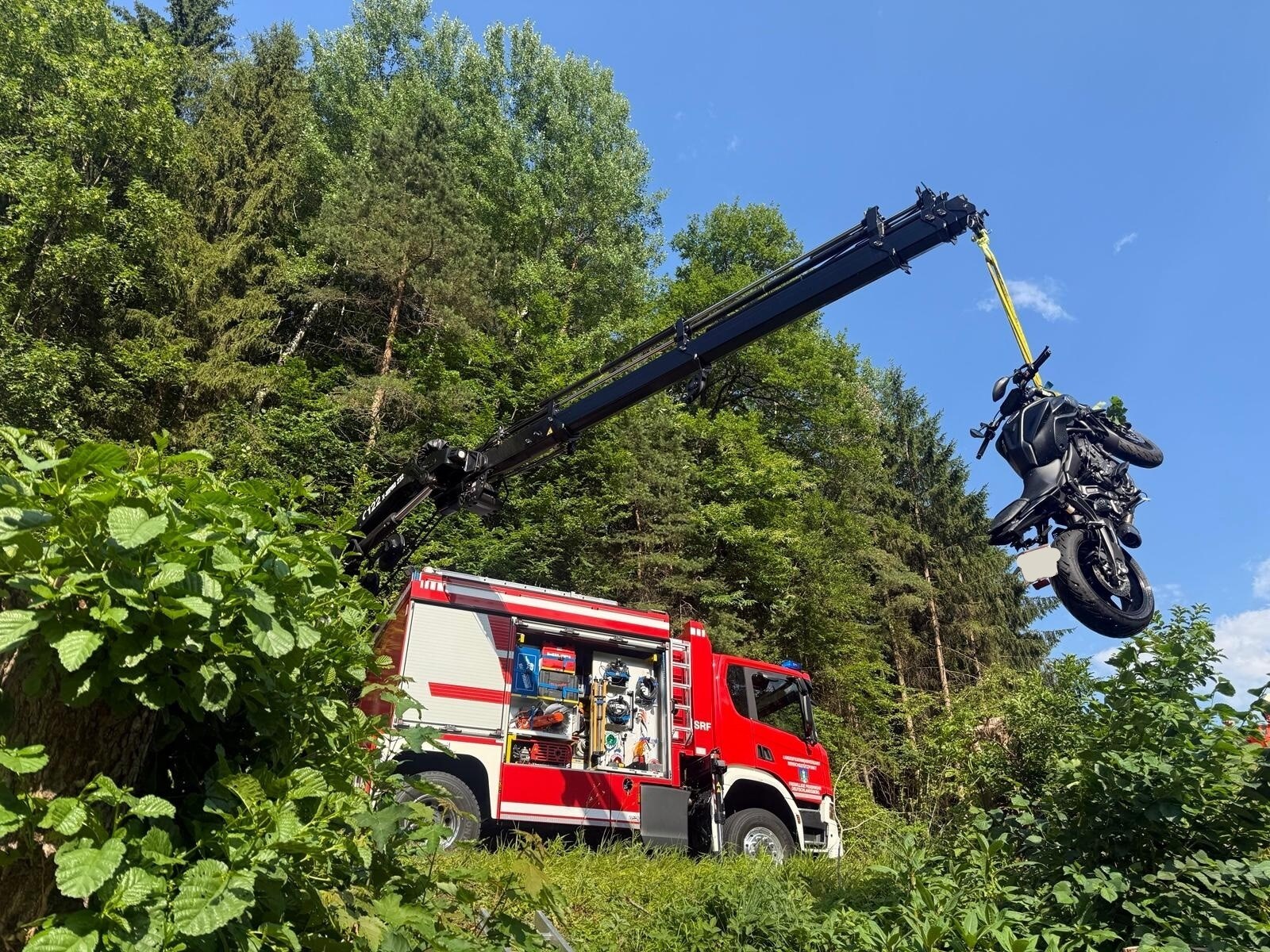 Die Feuerwehr kümmerte sich zudem um eine weitere Person, die nicht direkt am Unfall beteiligt war, und leistete psychologische Betreuung. Das Motorrad des verunfallten Lenkers wurde mithilfe eines Krans aus dem Bachbett geborgen.