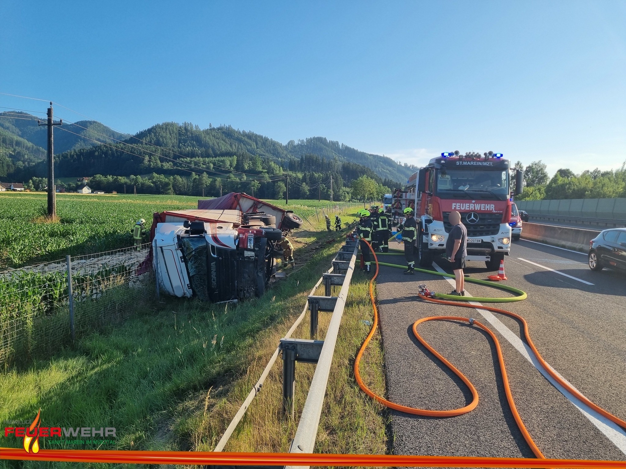 Gegen 18.40 Uhr am Dienstagabend wurden die Feuerwehren St. Marein im Mürztal und Mürzhofen zu einem Verkehrsunfall auf der S6 Semmering Schnellstraße alarmiert. Ein Lkw ist aus bislang ungeklärten Gründen zwischen St. Marein im Mürztal und Allerheiligen seitlich von der Straße abgekommen und kam in den Graben gestürzt.