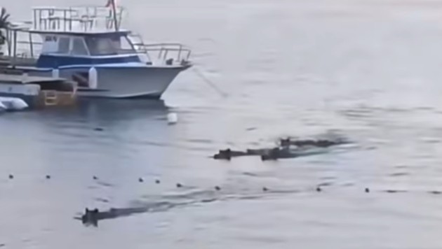 Das Nachrichtenportal Istra News postete ein Video auf Facebook, das die Wildschweine nahe der Küstenstadt Pula zeigt. Darunter sind auch mehrere Frischlinge, die gemeinsam mit ihren älteren Artgenossen fröhlich durch das Meer schwimmen – vorbei an Booten und hintereinander. Anschließend nutzen sie unterschiedliche Treppen, um wieder an Land zu kommen. Die Wildschweine laufen an einigen Strandbesucherinnen und Strandbesuchern vorbei, die stehen bleiben und ihre Handys für Fotos und Videos zücken.