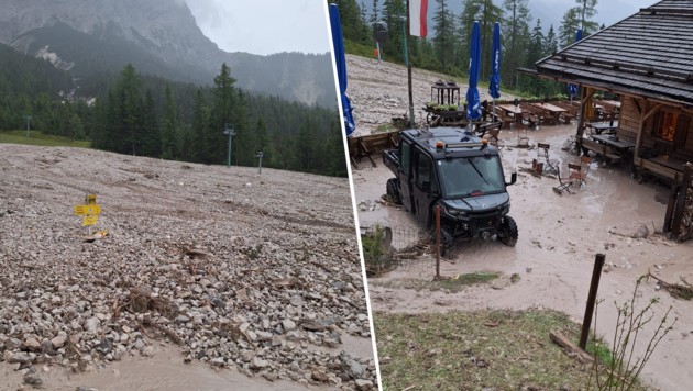 Auf der Skipiste, die direkt neben der Alm vorbeiführt, donnerte eine riesige Mure in Richtung Tal. Gewaltige Geröllmassen, schier unaufhaltsam. Auch die Alm selbst wurde von Schlamm und Geröll erfasst. „Insbesondere die Terrasse und der andere Außenbereich“, schildert Markus Köck, Bürgermeister von Ehrwald, im Gespräch mit der „Krone“.