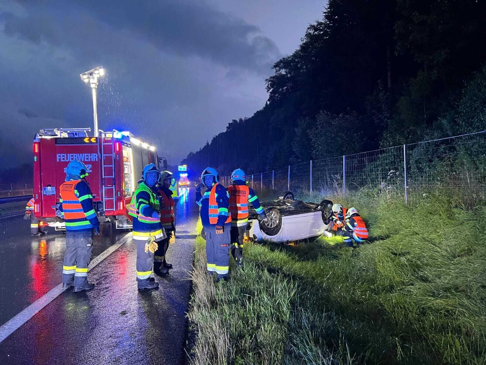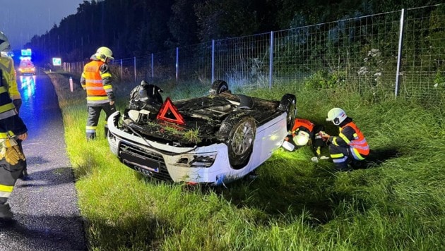 Mitten im Gewitter wurde die Freiwillige Feuerwehr Gaishorn am See am Mittwochabend gegen 20.30 Uhr zu einem Einsatz auf der A9-Pyhrnautobahn gerufen. Ein Pkw hatte sich gleich zweimal überschlagen und war neben der Fahrbahn am Dach gelandet. Um Schlimmeres zu verhindern und den nachkommenden Verkehr zu lenken, wurde als Erstes die Unfallstelle abgesichert.
