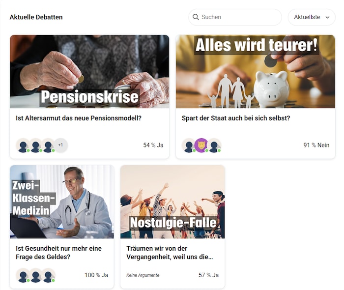 „Die Stimme Österreichs“ bietet Ihnen die Möglichkeit, gesellschaftliche Themen aktiv mitzugestalten. Ihre Meinung ist uns wichtig: Diskutieren Sie mit, nehmen Sie an Abstimmungen teil!