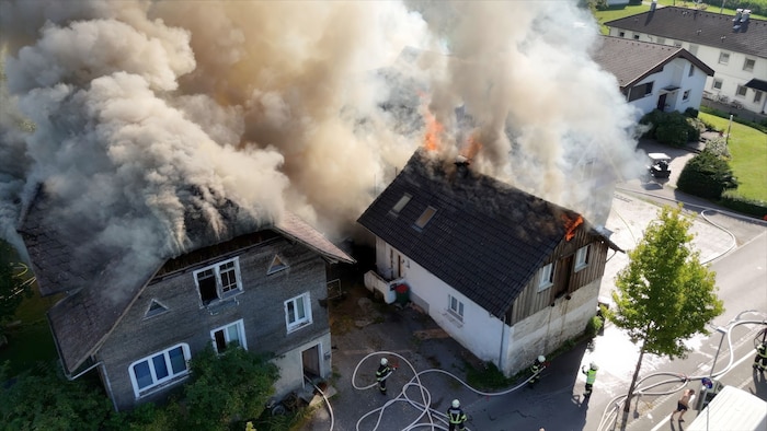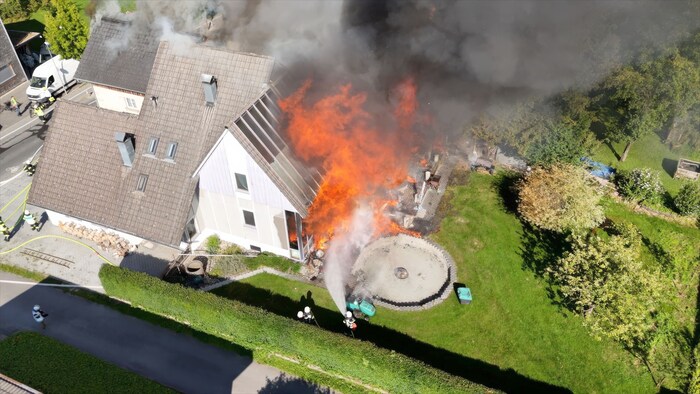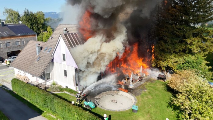 Ein Großeinsatz der Feuerwehren war am Dienstagnachmittag in der Vorarlberger Gemeinde Lauterach notwendig: Erst brannte es nur in einem Haus, doch die Flammen griffen auf weitere Immobilien über.