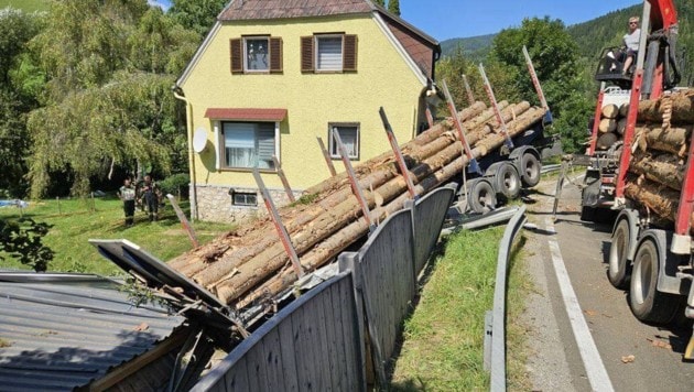 Riesen-Schreck im obersteirischen Obdach: In einer Linkskurve der B78 löste sich ein Sattelaufleger samt Baumstämmen von einem Lkw und stürzte auf ein Grundstück. Ein Gartengebäude wurde zerstört, die Bewohner waren erst kurz zuvor ins Wohnhaus gegangen.
