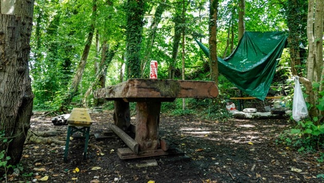 Die Begehung vor Ort bestätigt den Vorwurf. Alles deutet auf eine Art geheime Partylocation hin. Ein massiver Holztisch steht im Wald. Dahinter eine Biertischgarnitur unter einer Plane. Grillroste hängen an Bäumen. Leere Bierflaschen und -dosen liegen auf dem Boden, genauso wie Schuhe und Socken. Dazu kommt eine Feuerstelle, mitten im Wald. In Trockenzeiten könnte Feuer fatal sein.