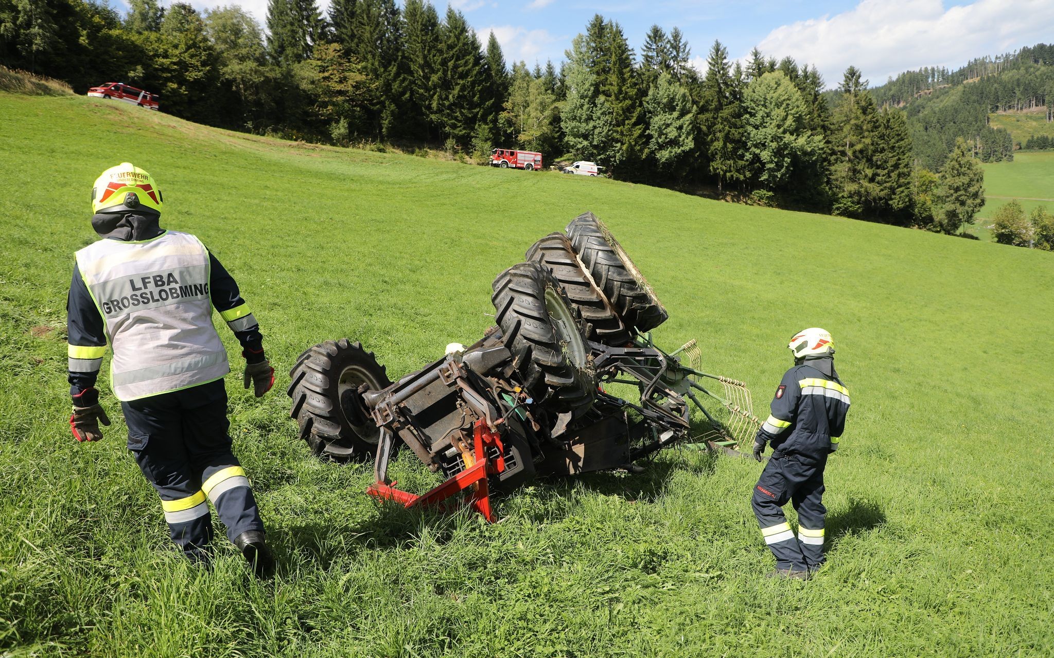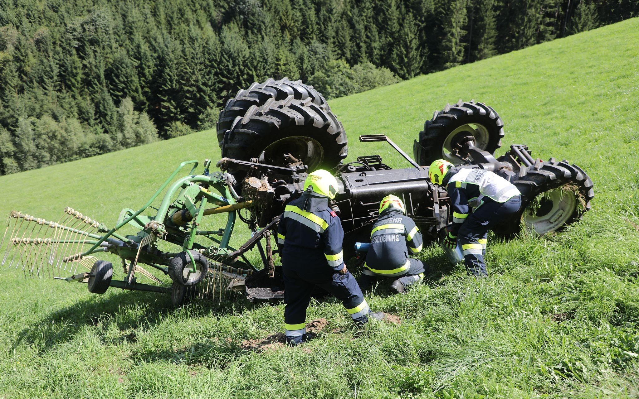 Ein Großaufgebot an Einsatzkräften wurde am Dienstag gegen 13.40 Uhr in der Gemeinde Lobmingtal (Bezirk Murtal) alarmiert: Aus bisher ungeklärter Ursache kam ein 63-Jähriger aus dem Bezirk Murtal mit seinem Traktor auf einer steilen Wiese seitlich ins Rutschen und stürzte rund 30 Meter über einen Abhang hinunter. Dabei dürfte der 63-Jährige offenbar vom Traktor geschleudert und überrollt worden sein.