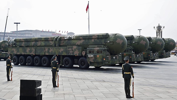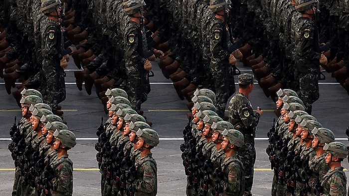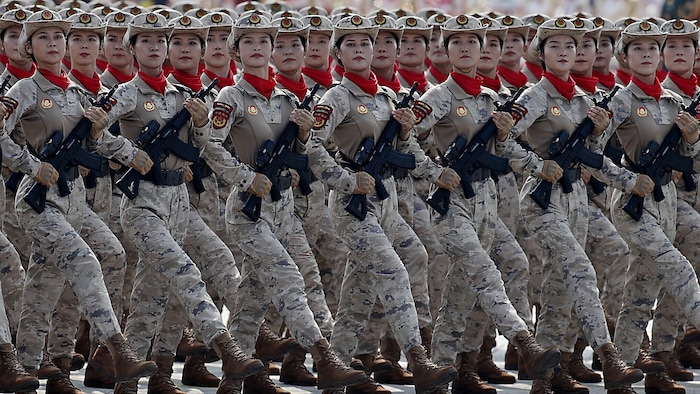 In einer offenen Limousine inspizierte Xi Truppen und modernste Waffensysteme wie Raketen, Panzer und Drohnen. Hubschrauber mit großen Bannern flogen während der von Symbolik und Propaganda geprägten Zeremonie in Formation über den Tiananmen-Platz. An der Schau nahmen mehr als 10.000 Soldaten, Hunderte Fahrzeugen und Flugzeuge teil.