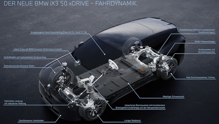 Highlight ist das „Heart of Joy“: eine Steuerungseinheit, die Antrieb, Rekuperation, Bremsen und Lenkung verknüpft. Sie rechnet zehnmal schneller als bisherige Systeme und soll dafür sorgen, dass sich der iX3 trotz knapp 2,3 Tonnen DIN-Gewicht agil und präzise anfühlet. 98 Prozent aller Bremsmanöver erledigt das Auto über Rekuperation – die Scheibenbremsen bleiben fast arbeitslos.