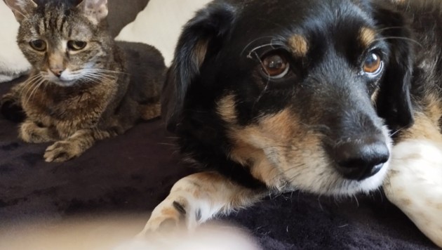 Allein an ihren Augen sieht man schon, dass für sie eine Welt zusammengebrochen ist. Mischling „Blitz“, schon betagte 13 Jahre alt, und Katze „Chanel“, 17 Jahre alt, stehen jetzt im Alter ganz allein da.