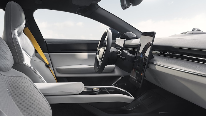 Die Materialien im Fahrzeug sind nach Möglichkeit nachhaltig, unter anderem kommen Naturfasern, recycelte Stoffe und chromfrei verarbeitetes Leder zum Einsatz. Zentrales Bedienelement ist ein 14,5-Zoll-Monitor, auf dem Googles Android-Infotainmentsystem läuft.