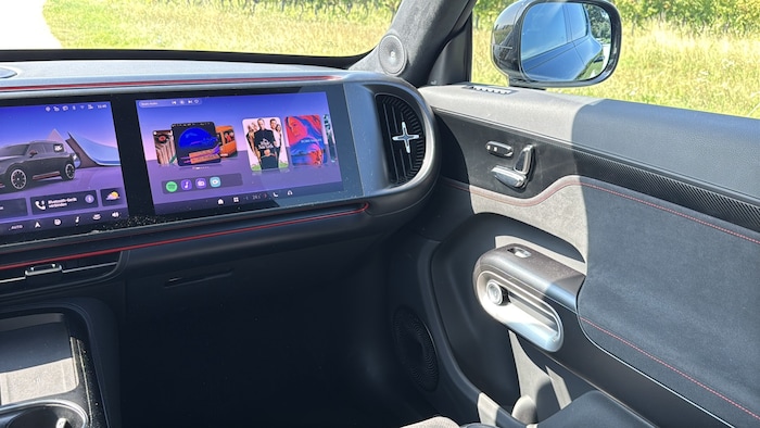 Schon der Blick auf den Radstand (2,90 Meter) lässt ahnen, was innen wartet: Platz in Hülle und Fülle. Auf der Rückbank können Erwachsene locker die Beine ausstrecken, der Kofferraum schluckt 630 Liter (mit umgeklappten Lehnen 1530 l), dazu gibt’s einen Frunk mit 47 l Volumen. Der Innenraum wirkt verspielt, aber hochwertig – reichlich Ablagen, belüftete Handy-Ladeschalen, sogar bezogene Türtaschen. Sogar 1,5 Liter große Metall-Trinkflaschen passen in die Halter. Zwei 13-Zoll-Displays und ein 10,25-Zoll-Digitaltacho dominieren das Cockpit, optisch jugendlich schick – nur leider bei Sonneneinstrahlung stark spiegelnd.