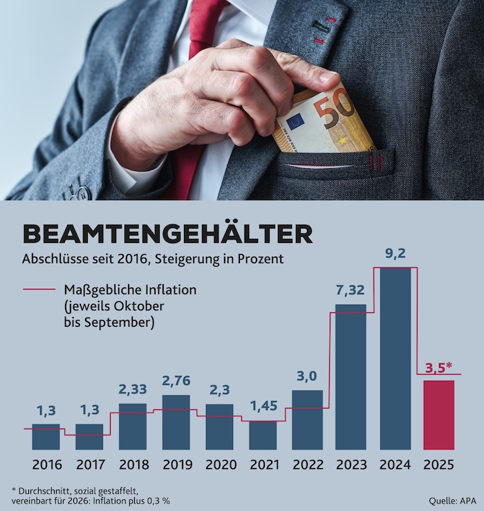 Unter angespannter Stimmung sind Dienstagmittag die Beamtengehaltsverhandlungen gestartet. Die Regierung will angesichts der Budgetnot die bereits beschlossene Gehaltsanpassung für 2026 wieder aufschnüren, Kanzler Christian Stocker auch dadurch die Lohn-Preis-Spirale der letzten Jahre brechen. Die schwierige Situation hat ihre Wurzel im Vorjahr, als die Gewerkschaft für 2025 einen Abschluss von 3,5 Prozent und damit 0,3 Prozentpunkte unter der Teuerung billigte, sich dafür aber gesetzlich zusichern ließ, dass dieser Verlust kommendes Jahr wieder aufgeholt wird.
