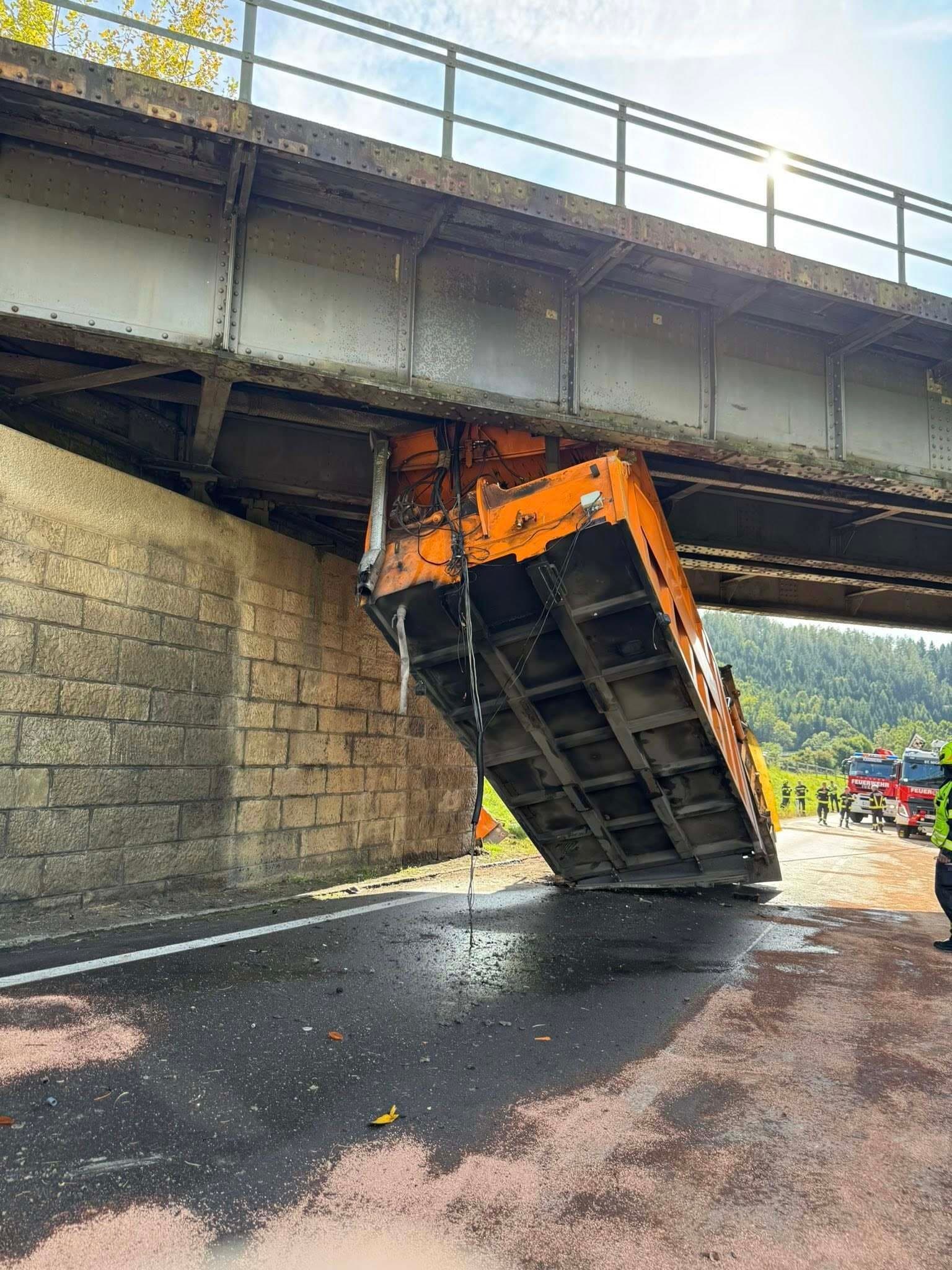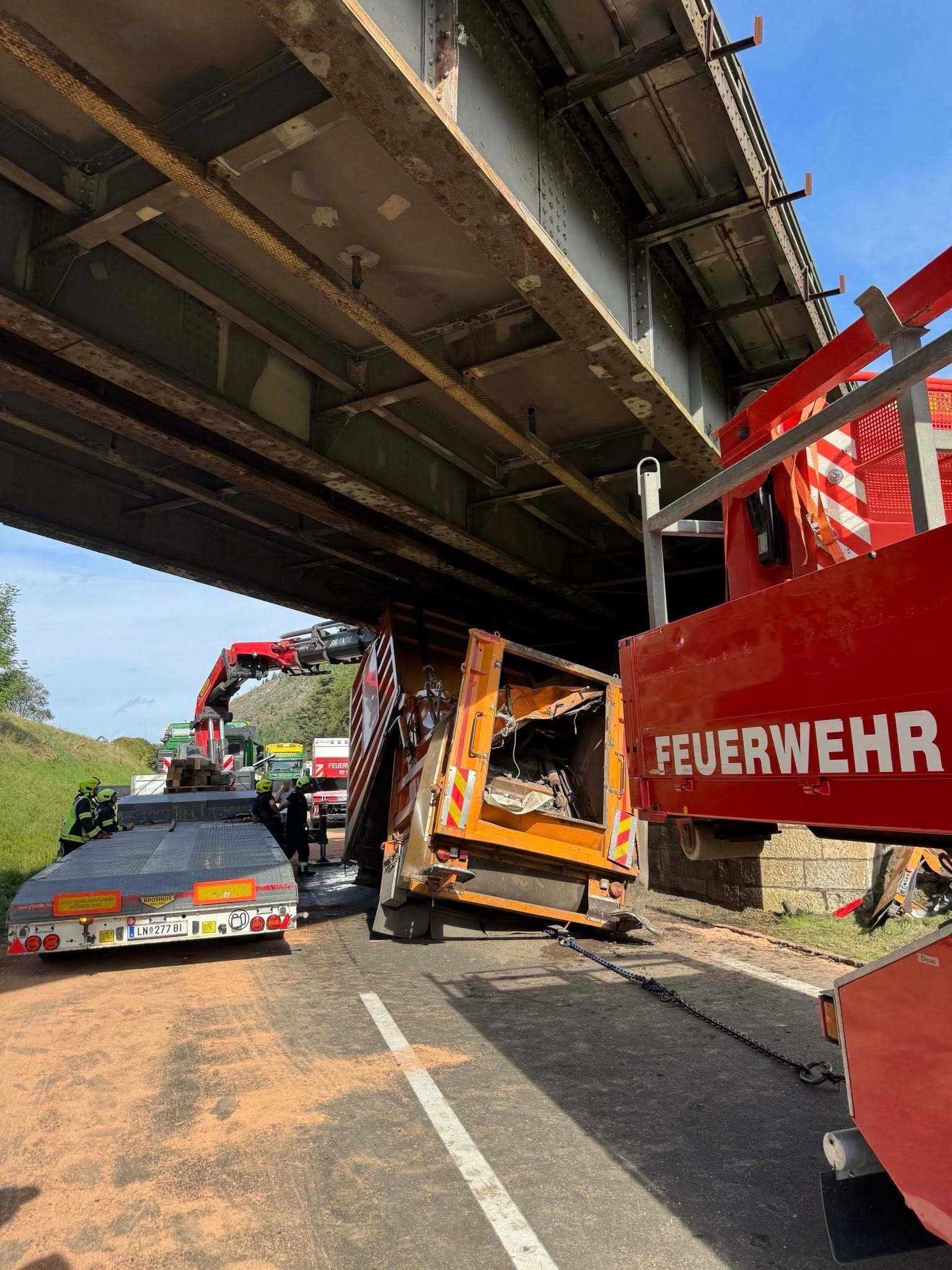 Durch den Aufprall wurde der komplette Aufbau des Müllwagens heruntergerissen. Während sich dieser zwischen Straße und Brücke verkeilte, schlitterte das Zugfahrzeug noch 30 Meter weiter, ehe es zum Stillstand kam.