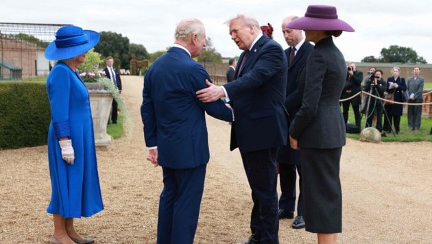 Nach der Landung ihres Hubschraubers Marine One am Mittwoch wurden die Trumps zunächst von Prinz William und Kate Middleton auf dem Gelände von Windsor Castle begrüßt und anschließend zu den Monarchen geführt.