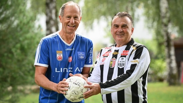 „Ich hab’ früher schärfer geschossen als du“, lacht Klaus Lindenberger (68). „Stimmt – aber halt irgendwohin“, kommt’s von Max Hagmayr (68) beim Foto-Shooting mit einem Grinsen zurück: Ja, als die „Krone“ im Vorfeld des Sonntag-Derbys LASK – BW Linz die beiden Legenden, die beide für Schwarz-Weiß und auch Blau-Weiß spielten, zum Talk bat, lief richtig der Schmäh.
