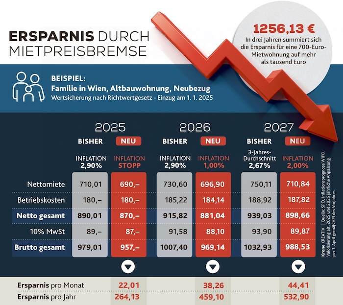 Die Mietervereinigung hat ausgerechnet, wie viel sich eine Familie mit einer Mietwohnung im Altbau dank des Mietenpakets der Regierung erspart: im ersten Jahr 264 Euro, im zweiten 459 Euro, im dritten 533 Euro, in Summe: 1256 Euro.