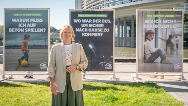 Die Grüne Politikerin enthüllt am Freitag aber auch weitere Plakate mit Enkelkinder-Fragen. „Warum muss ich auf Beton spielen?“, „Wo war der Bus, um sicher nach Hause zu kommen?“ und „Bin ich nicht krank genug?“. Es seien Fragen, die sich die Niederösterreicher heute schon stellen, meint Krismer. Wie auf den Plakaten zu sehen, widme man sich zunächst den Themen Verbauung, öffentlicher Verkehr und Gesundheitsversorgung. Es sei aber eine „Langzeitkampagne“, um den Menschen künftig eine Möglichkeit zu bieten, wenn sie Antworten auf brennende Fragen wollen.